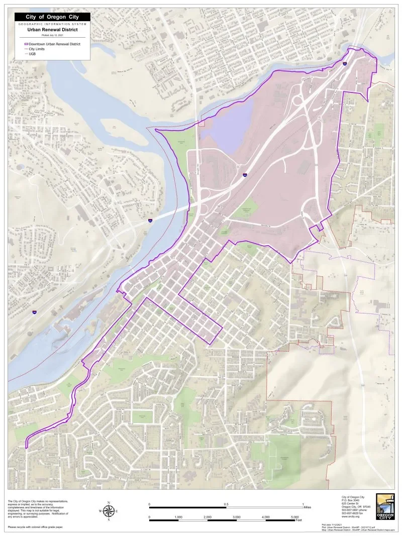 Oregon City has one urban renewal area, the Downtown/Northend URA. The URA includes Downtown Oregon City, Singer Hill Road and High Street in the Historic McLoughlin area, the area around The Cove and Abernathy Road to Highway 213. Please refer to the Downtown/Northend URA map for more details.